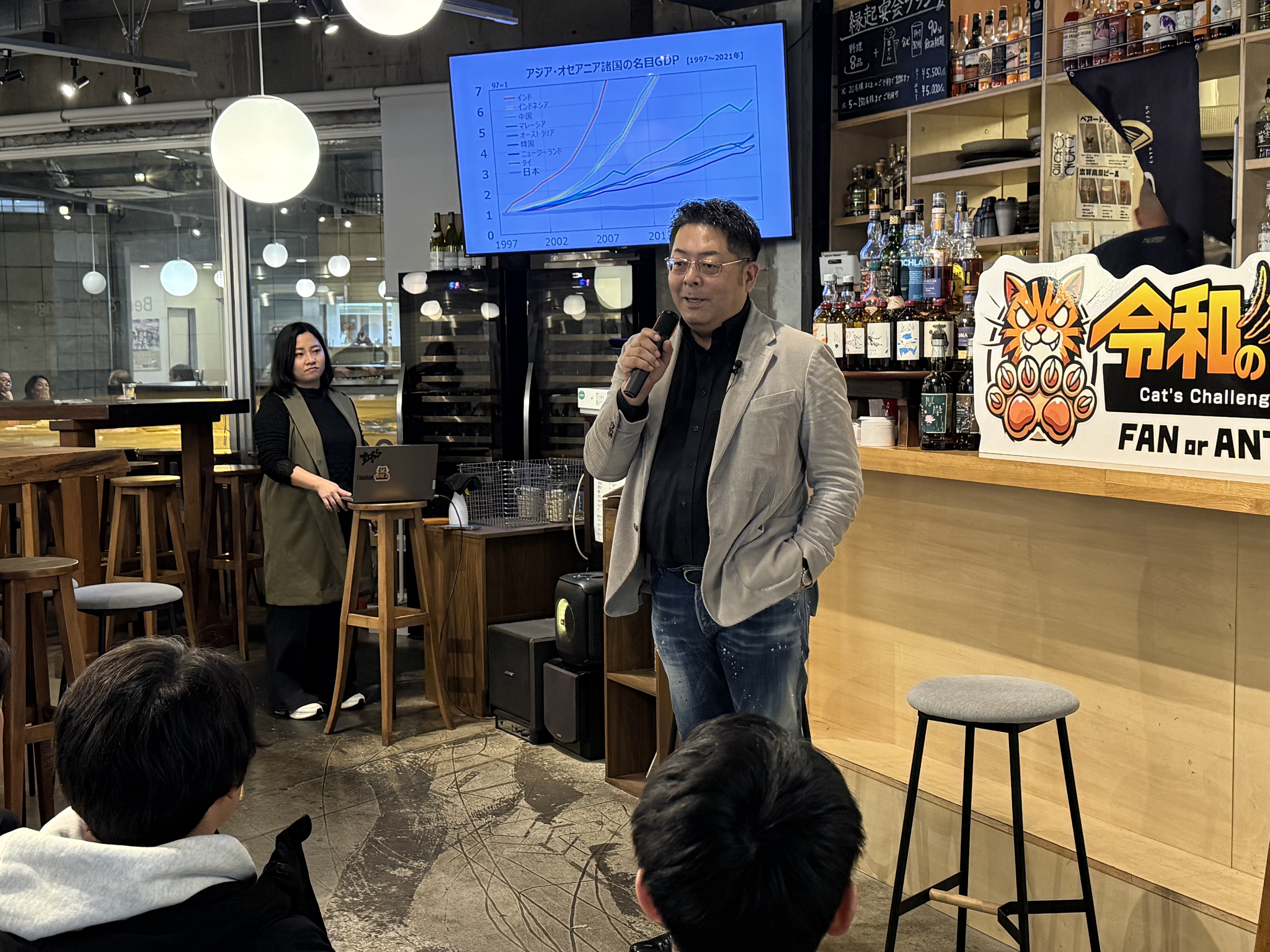 といった議論が自然発生的に生まれた点です。 単なる若者講演ではなく、世代を超えた本気の対話が実現しました。 令和の猫では、校長の当社代表の山本も 初めにピッチさせていただきました。